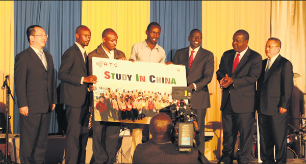 Kenya's Vice-President William Ruto (3rd from right), together with other invited guests, takes a photo with the winners of AVIC International's Africa Tech Challenge. Liu Hongjie / China Daily