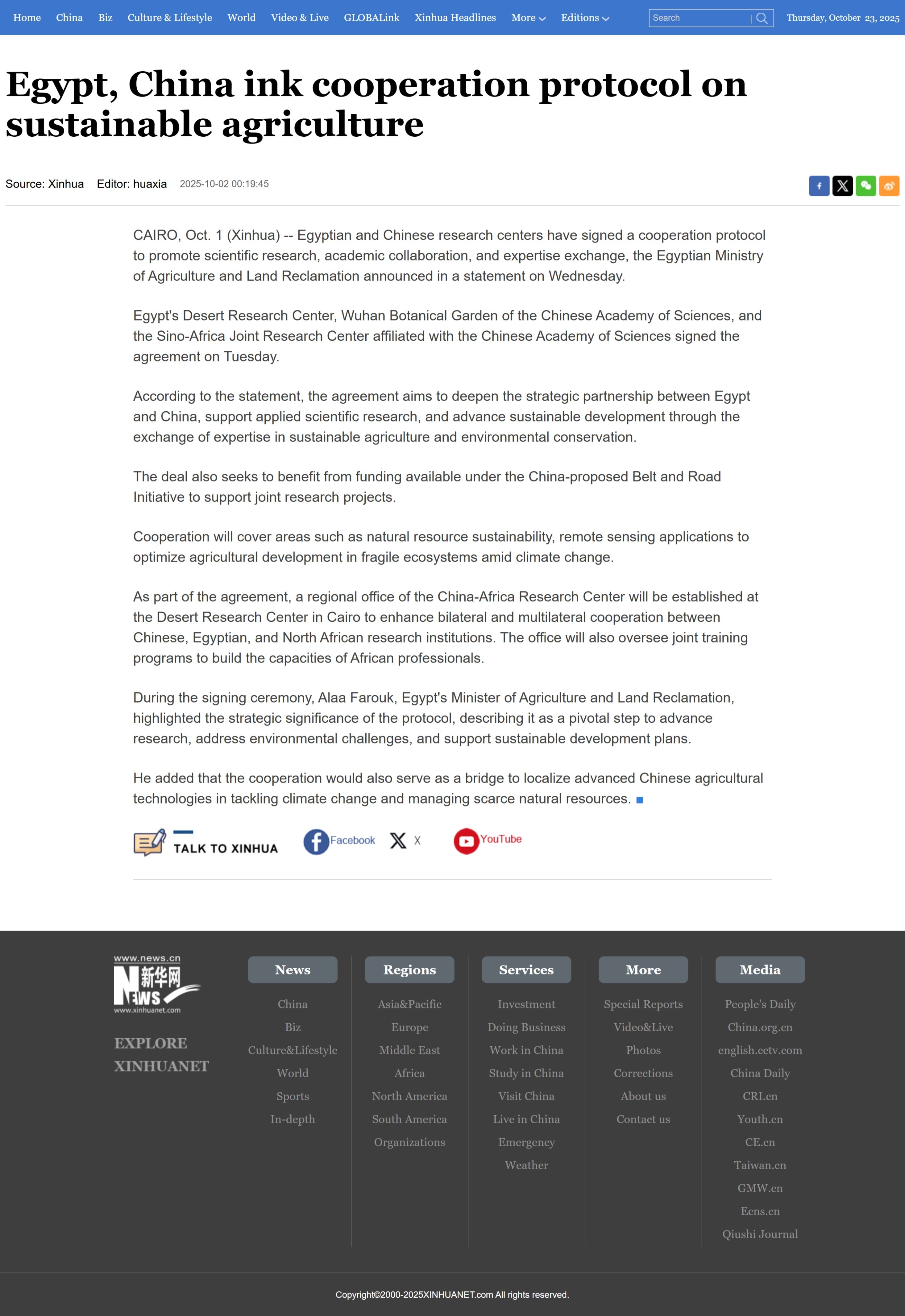 Egyptian and Chinese research centers have signed a cooperation protocol to promote scientific research, academic collaboration, and expertise exchange, the Egyptian Ministry of Agriculture and Land Reclamation announced in a statement on Wednesday.