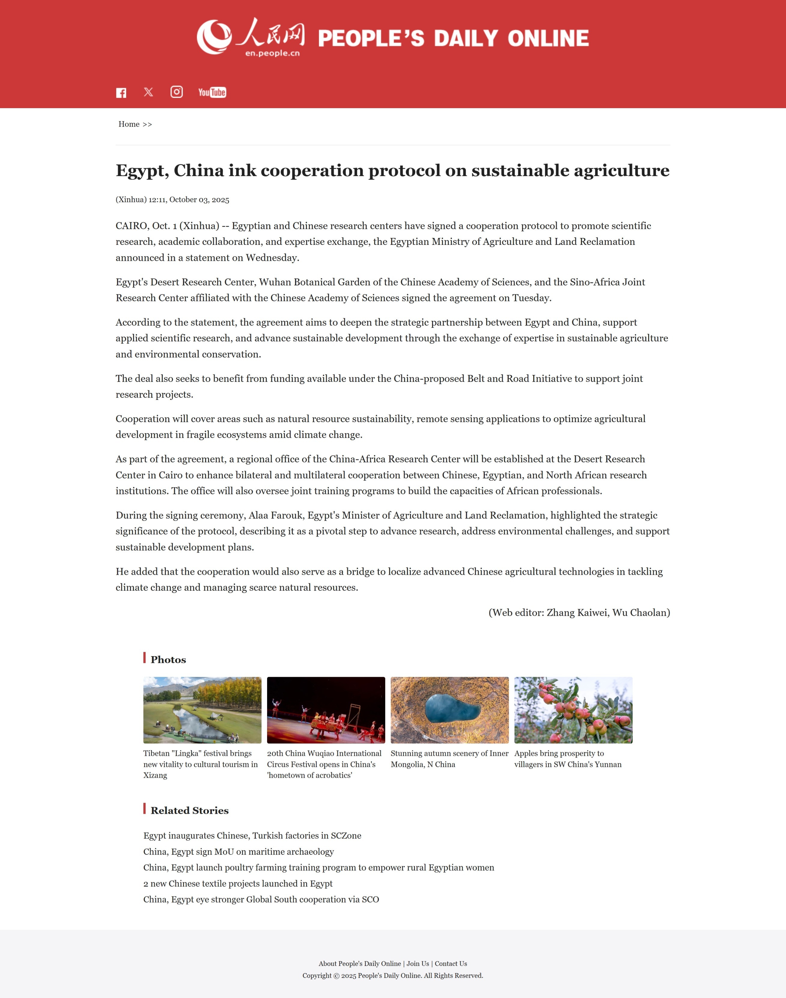 Egypt's Desert Research Center, Wuhan Botanical Garden of the Chinese Academy of Sciences, and the Sino-Africa Joint Research Center affiliated with the Chinese Academy of Sciences signed the agreement on Tuesday.