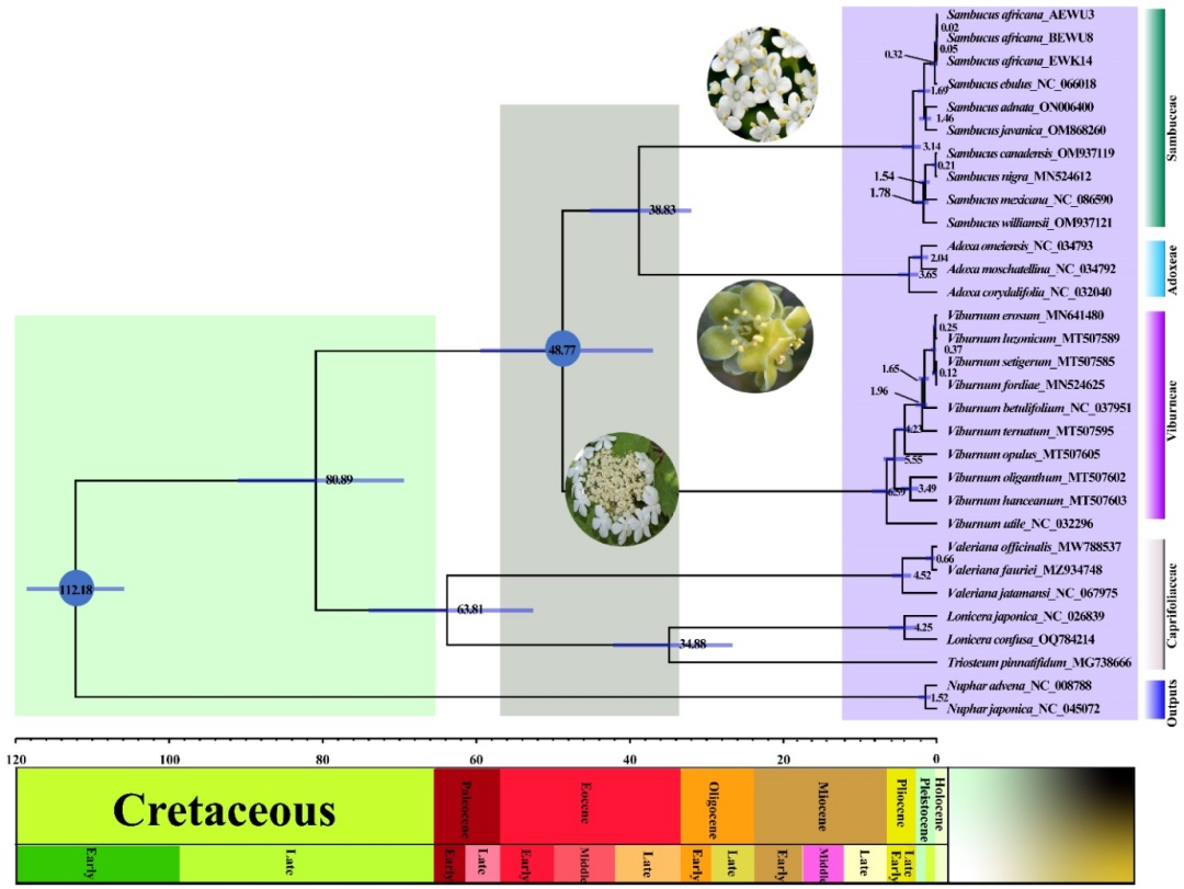 进一步解析系统发育与进化历史表明,非洲接骨草与分布于欧亚大陆的矮接骨木(Sambucus ebulus)构成姐妹群(ML 支持率≥83%,BI 后验概率≥0.4),确立其独立物种地位。分子钟测算表明,接骨木属与近缘的五福花属(Adoxa L.)的分化发生于始新世(约 3800 万年前),而非洲接骨草的种内分化始于晚更新世(约 32 万年前)(图2),与东非高原隆升引发的生态位重构高度吻合,并揭示其祖先可能起源于亚洲,经北美长距离扩散后抵达非洲。
