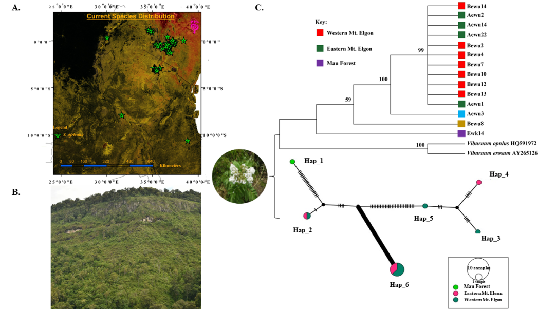 非洲接骨草(Sambucus africana Standl.)隶属荚蒾科(Viburnaceae)接骨木属(Sambucus L.),为东非特有物种,分布于海拔 1700-3200 米山地,其果实是当地鸟类和哺乳动物重要食物来源,且在当地传统医学中具有重要应用价值,保护意义显著。然而,在东非山地生态系统碎片化与气候变化背景下,该物种的遗传多样性现状与分布动态尚未被系统研究。