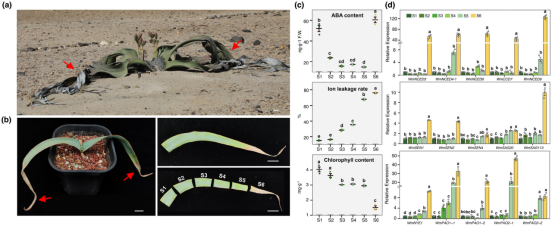 百岁兰 (Welwitschia mirabilis) 是单科单属寡种的裸子植物,现狭域分布于非洲安哥拉南部及纳米比亚西部沿海的荒漠地带,终年仅着生一对真叶,即便生活在纳米布沙漠 (Namib) 常年高温、干旱且土壤营养匮乏的极端环境中,个体寿命仍可达1500年以上,故又名“千岁兰”。相较人们对其生态环境适应能力的好奇与认知,关于其叶片适应与衰老的分子调控机制鲜有报道。叶片衰老是叶片发育的最终阶段,其启动和进程受叶片年龄与植物激素等影响。在适宜环境下,叶片衰老作为主动调控机制,将营养物质从叶片转运至花、果实、种子等,以提升植株生长和繁殖效率。在不利环境下,植株会被动触发叶片衰老,以此作为应对环境变化的权衡策略。因此,探究植物叶片衰老的生态遗传因素及其复杂调控机制是基础生物科学领域长期以来的热点问题,对农作物改良、产量提升等方面具有重要理论意义。