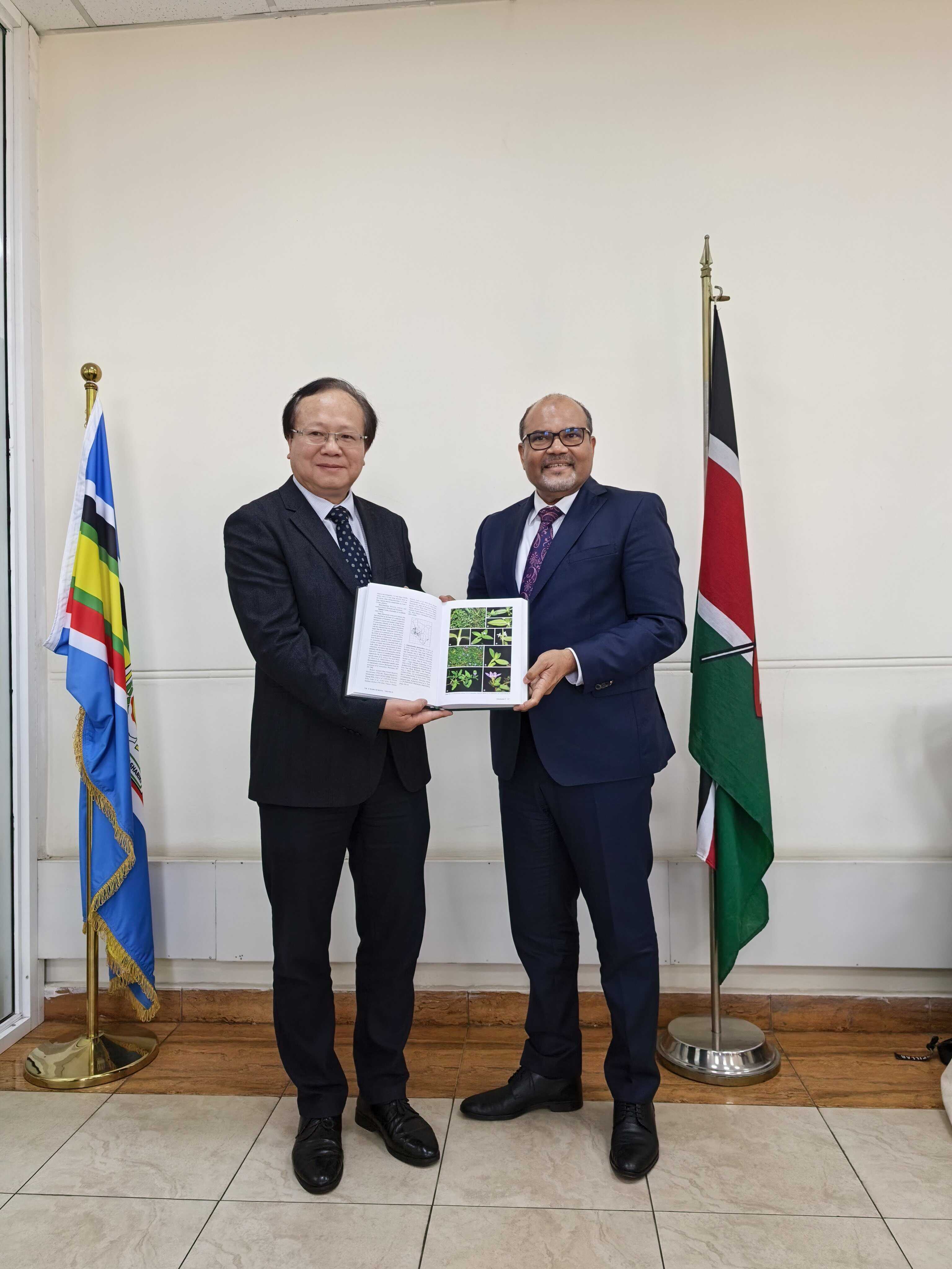 王青锋主任向Shaukat Abdulrazak部长(右)赠送《肯尼亚植物志》